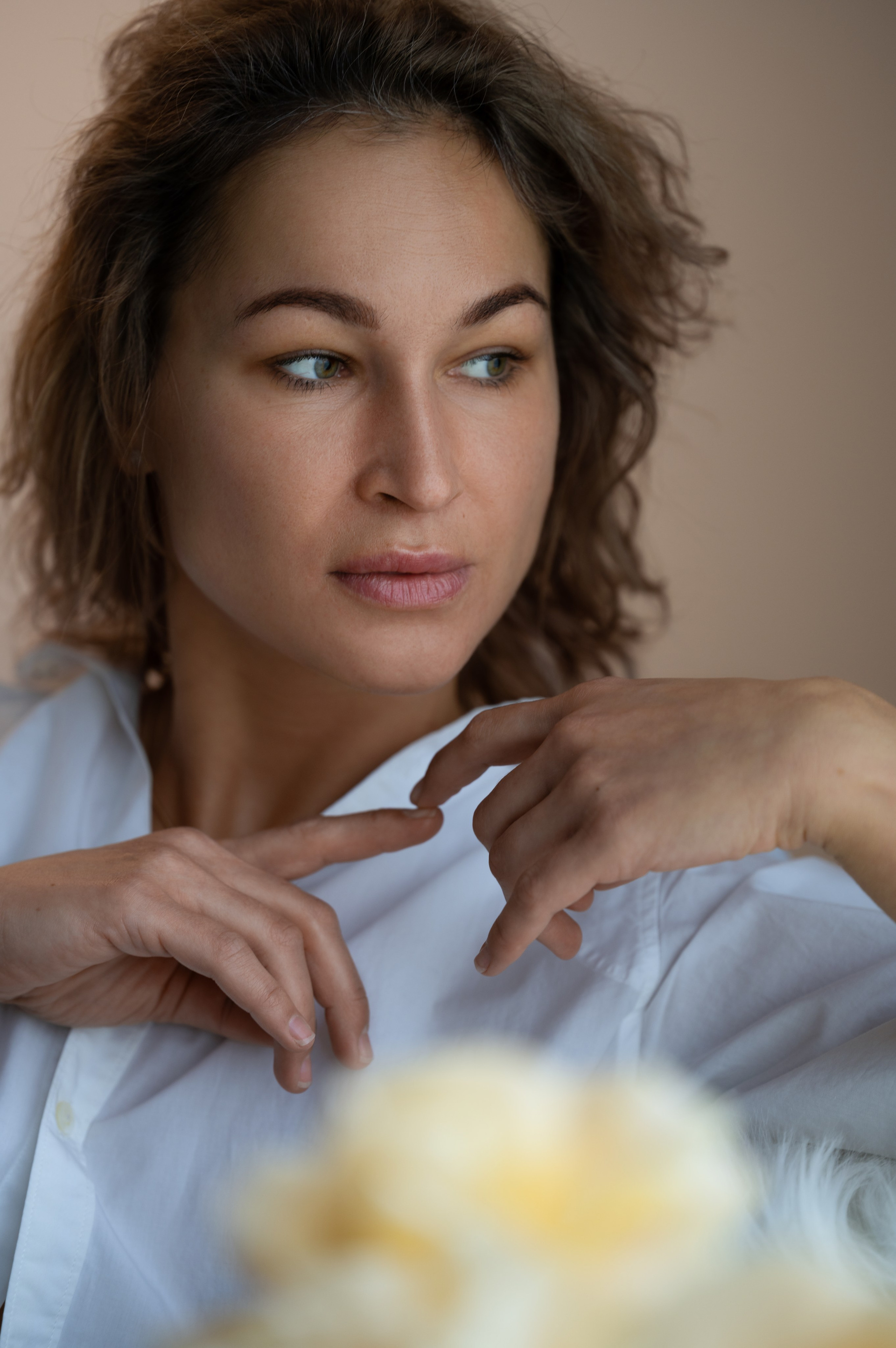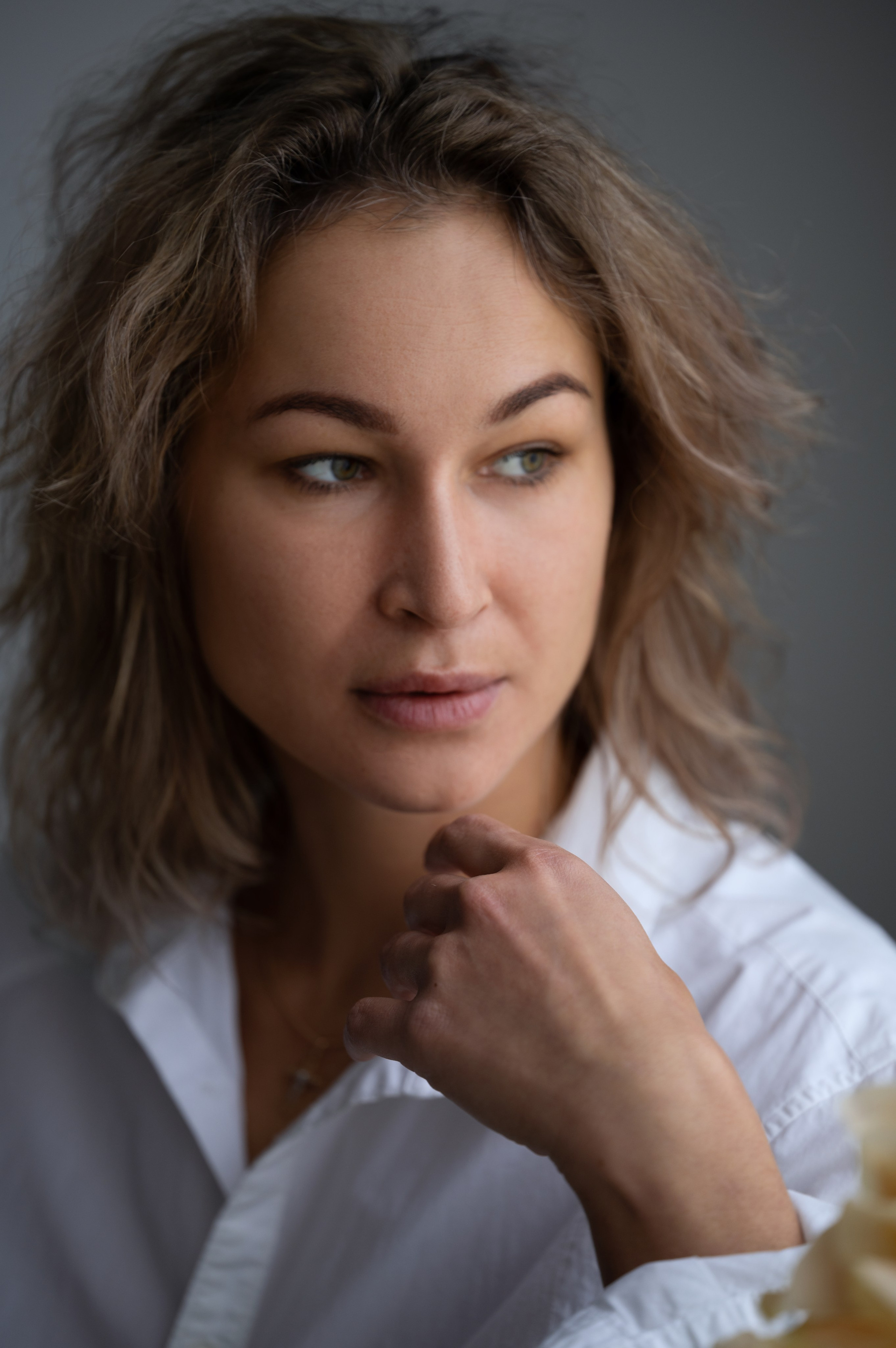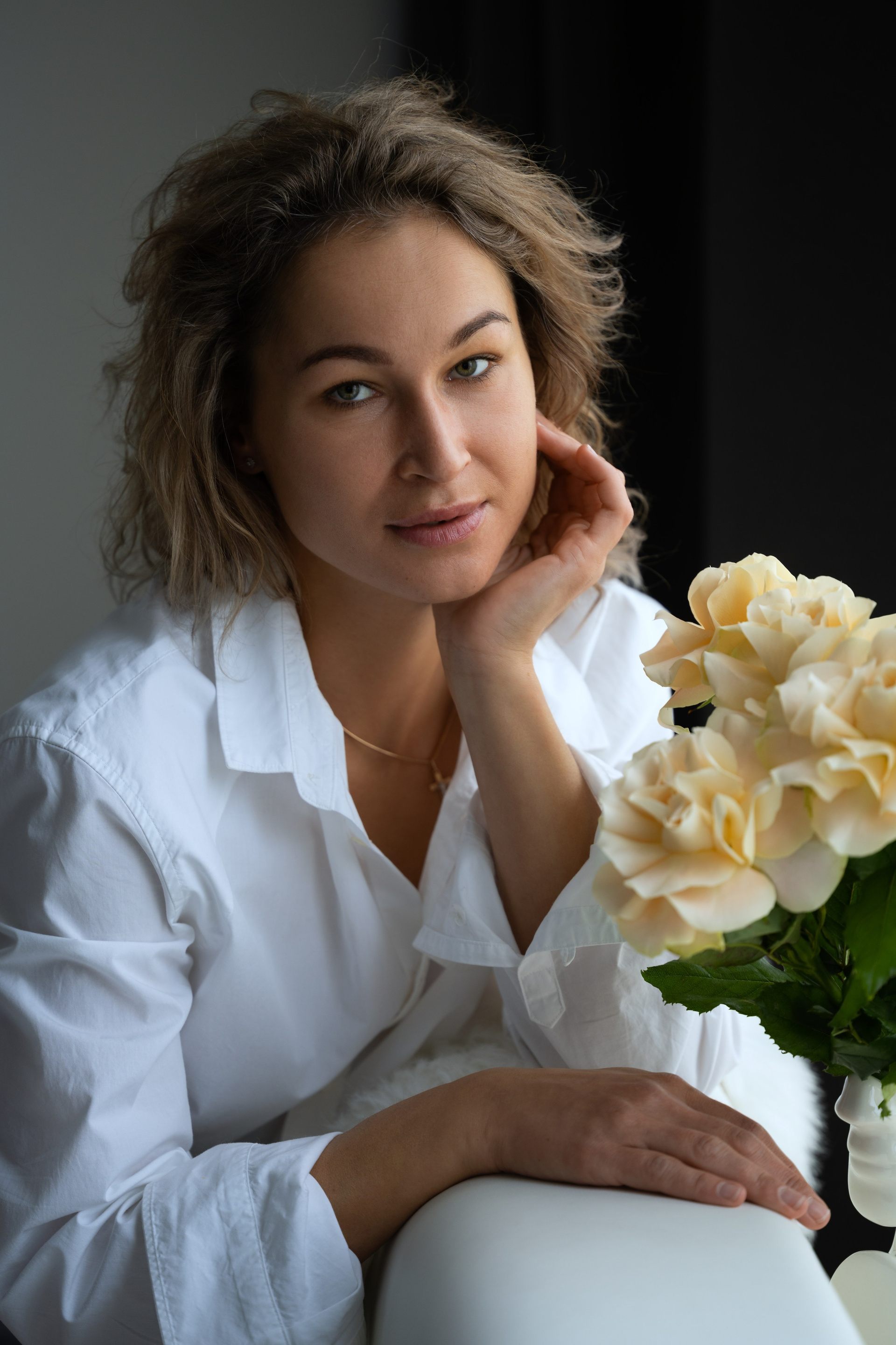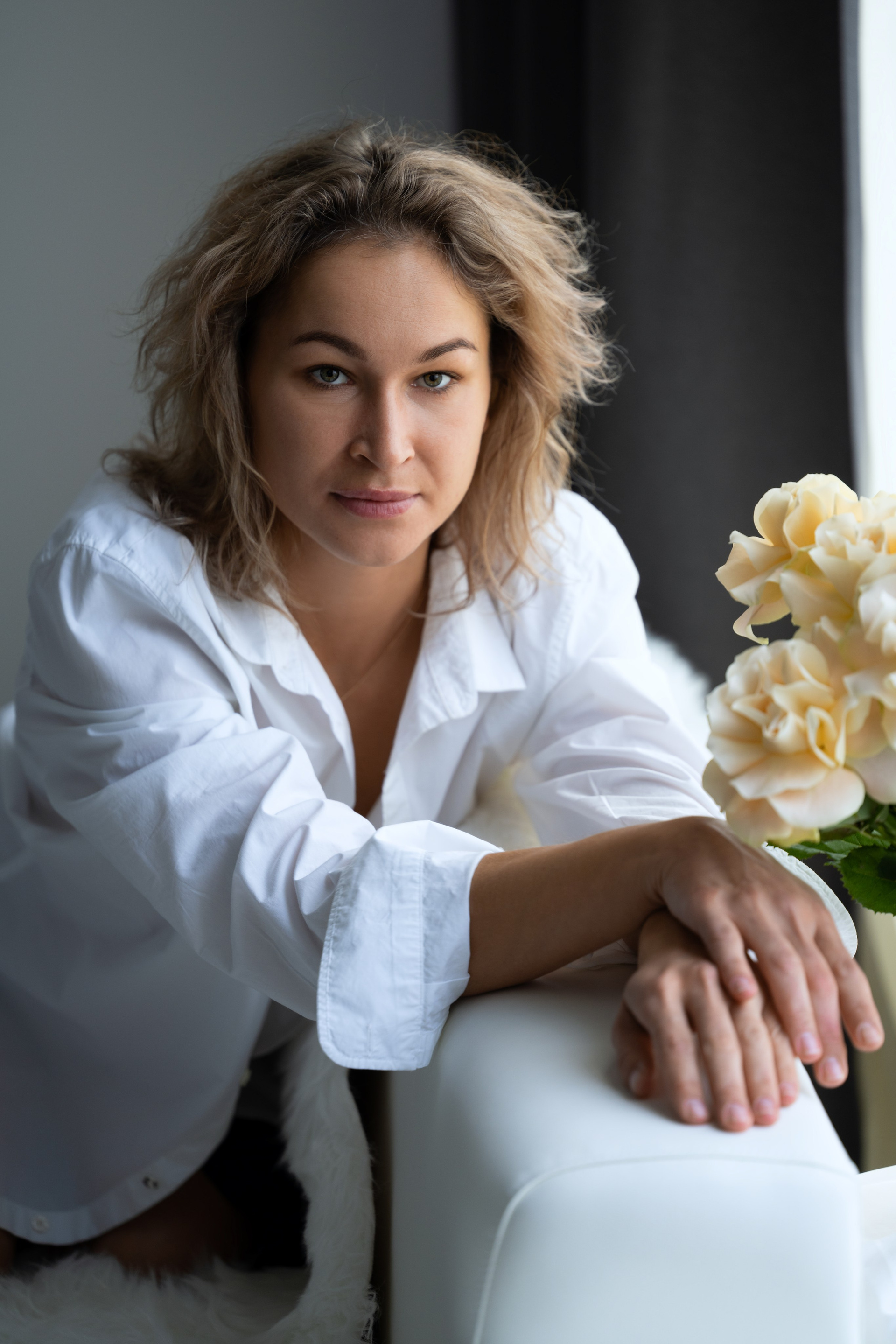 Женственная нежная съемка в белом платье и белой рубашке